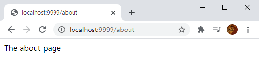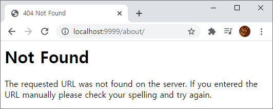 about의 경우 http://localhost:9999/about 의 경우만 접근이 가능하고 http://localhost:9999/about/ 은 404 에러를 띄우게 된다.
