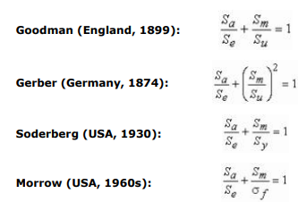 위 그림과 같은 Haigh diagram"을 생성하려면 매우 많은 양의 테스트가 필요하며, 평균과 교대 응력의 모든 조합에 대한 곡선을 개발하는 것은 일반적으로 비현실적이다. 이러한 어려움을 해결하기 위해 교대 스트레스를 평균 스트레스와 연관시키는 몇 가지 경험적 관계가 개발되었다. 아래 수식들은 경험적 관계를 정립한 내용들이다.
