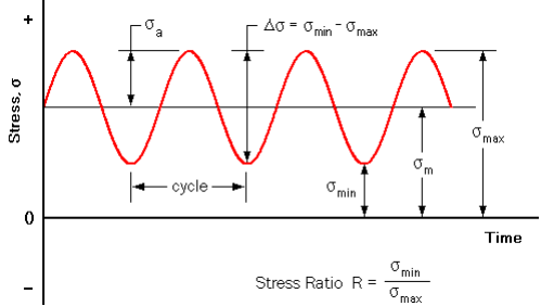 실험실에서 수집된 대부분의 기본 S-N 피로 데이터는 "reversed stress cycle"을 사용하여 생성된다. "reversed stress cycle" 는 응력이 양수와 음수 크기로 왔다갔다하는 것이다. 그러나 실제 하중 적용에는 아래 그림과 같이 진동 응력이 중첩되는 평균 응력이 수반된다(양수 측에서만 동작). 다음 정의는 교대(alternating) 및 평균(mean) 응력이 모두 있는 스트레스 주기를 정의하는 데 사용됩니다. 응력 범위는 사이클의 최대 응력과 최소 응력 사이의 차이입니다. 응력은 그리스어 감마로 표현한다.