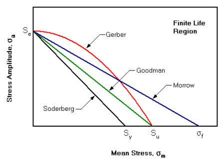 위 그림에서 Se는 Endurance limit, Sy는 Yield strength (내부에 변형 발생하지않고 돌아가는 힘), Su는 Ultimate strength (Stress-Strain 그래프에서 Stress가질 수 있는 최대값), 감마f는 fracture strength( Stress-Strain 그래프에서 망가질때 strength)이다. 한가지 알아야할 부분은 Se만 amplitude 이고 나머지는 mean 값이다.