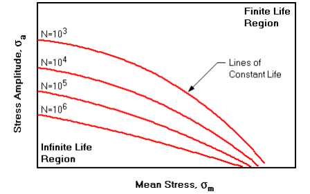 0이 아닌 평균 응력을 사용한 피로 테스트의 결과는 아래 그림과 같이 "Haigh diagram"으로 나타낸다. "Haigh diagram"은 X축을 따라 평균 응력, Y축을 따라 진동 응력 진폭을 나타낸다. 상수 수명 선(Lines of Constant Life)은 데이터 점을 통해 그려집니다. 무한 수명 영역은 곡선 아래의 영역이고 유한 수명 영역은 곡선 위의 영역입니다. 유한 수명(Finite life)에서 내구성 한계(endurance limit)은 Mean stress가 0이고 R = -1인 "reversed stress cycle" 와 같다. 왜냐하면 SN 그래프는 "reversed stress cycle" 를 기초로 만들었기 때문이다.