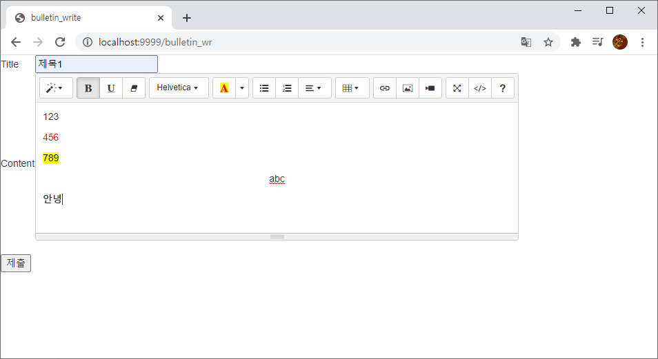 블로그 만들기(2)에서 만들었던 내용에서 웹에디터를 추가해보겠다. 웹에디터란 흔히 티스토리나 네이버 블로그에서 글을 작성할때 색깔이나 편집을 편하게 하도록 만들어진 UI이다. 직접 만드는 것은 javascript 나 css에 굉장한 노력이 들어간다. 하지만 이를 간단히 해결하는 방법은 summernote라는 오픈 소스를 사용하는 것이다. 오픈 소스를 통해 아래와 같은 웹에디터를 가질 수 있다.