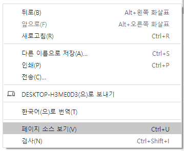 요즘 나오는 웹페이지들은 마우스 오른쪽 클릭으로 아래 그림 처럼 페이지 소스 보기를 하면 복잡한 코드를 확인할 수 있다.