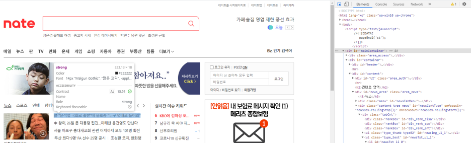 또는 웹 화면에서 마우스 오른쪽 클릭 하여 검사를 클릭 한다.