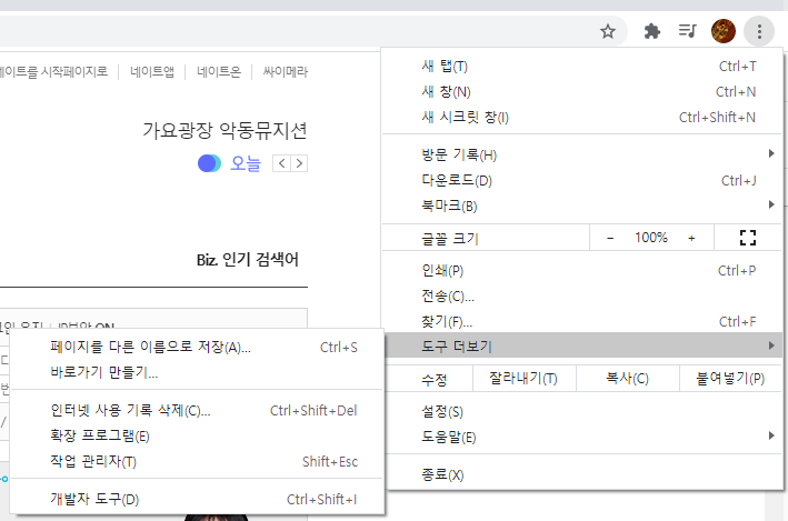 나는 크롬만 사용하므로 크롬 기준으로 설명하겠다. 우선 크롬에서 원하는 웹페이지를 들어 간다. 그리고 오른쪽 상단에 점 세개 있는 부분을 클릭하면 도구 더보기 >> 개발자 도구 로 들어 간다.