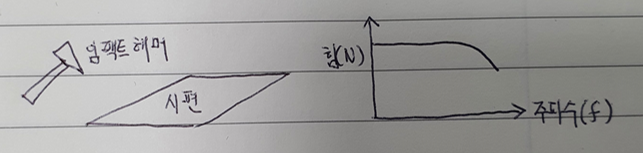 간단히 말하자면 그림1처럼 임팩트 해머로 시편을 치면 임팩트 해머에 달린 센서에서 펄스 형태의 힘을 측정한다. 이상적인 펄스 신호는 주파수 전지역에서 일정한 크기를 가진 형태지만 현실은 그림1의 오른쪽 그림처럼 주파수가 올라가면서 힘이 떨어진다.