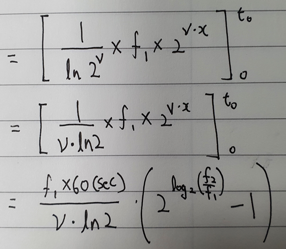 f1(Hz)에서 f2(Hz) 로 v(Octave/min)의 속도로 주파수가 증가하는 Sweep 파형의 1번 Sweep 시 발생하는 사이클(Cycle) 총 수는?