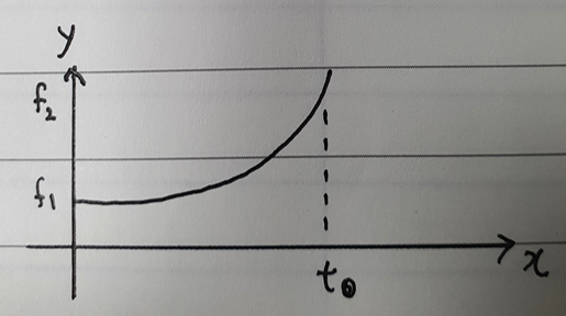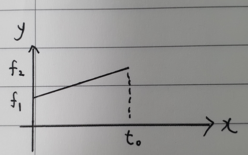 그림2에서 x축은 시간 y축은 주파수이다. 이번 문제에서 시간에 따른 주파수는 선형적으로 변하므로 그림2처럼 직선으로 증가한다. 사이클의 총 수는(The number of cycle) 그래프 t0까지의 아래 면적이다. 왜냐하면 주파수(f) = 사이클수(N) / 시간(t) 이기 때문이다.