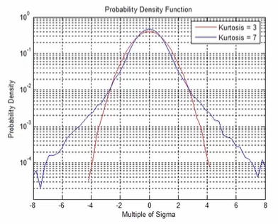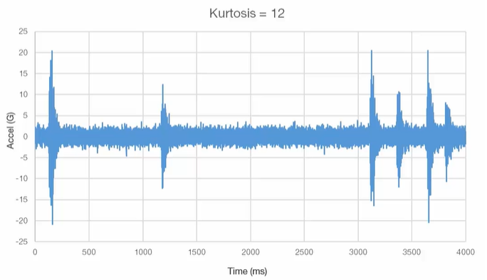 일반적인 진동은 가우시안(Gaussian) 확률 분포를 따라 간다. 가령 공기 저항을 받는 비행기의 진동 모드는 가우시안 확률분포에 수렴한다. 하지만 비포장 도로를 달리는 자동차나 철로를 달리는 기차의 진동에서는 예상치 못한 Peak 값이 발생한다. 아래 그림과 같이 Kurtosis 가 적을 경우 랜덤 진동이 균등하게 진행되고 커질 경우 Peak 값이 여러번 발생한다.