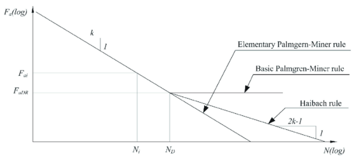MIL-STD-810G 에 따르면 시험 시간을 줄이기 위해 가장 일반적으로 사용되는 방법은 Miner Palmgren의 가설(hypothesis)이다. Power law(지수)로 fatigue의 관계를 정리하기 때문에 Log-Log plot에서 SN curve 기울기가 선형(Linear)이다. (그림1 참조)