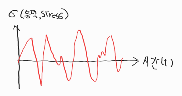 레인플로우 카운팅 알고리즘은 피로(Fatigue) 분석에 사용됩니다. 그림1과 같이 시간에 따른 응력(stress) 변화가 그림처럼 전개 되면 피로 분석이 쉽지 않다. Rainflow Counting algorithm은 여러 성분이 포함된 그래프를 단순한 형태의 stress reversal (양과 음으로 변환하는 형태)로 바꾸어 준다. y축은 stress, strain 등 가해지는 입력에 따라 다양하게 적용 가능하다.