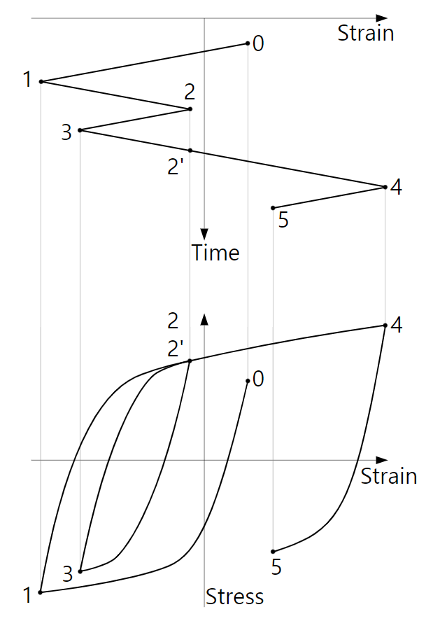 Rainflow counting 전개는 아래 그림2와 같이 진행 된다. 그림2의 위에 그림은 그림1과 같은 그래프를 눕혀 놓은 것이다. 시간이 흐름에 따라 0 -> 1 -> 2 -> 3 -> 2' -> 4 -> 5 식으로 전개 된다. 시간과 Strain그래프를 Stress - Strain 그래프로 변환한 것이다. 시편(UUT, unit under test) 가 받는 strain 에 따라 Strain Stress 관계 그래프가 그림2의 아래 그림처럼 Close loop 형태로 진행 된다. 이를 시편이 가지는 memory effect라고 하고 해당 현상을 stress-strain hysteresis (히스테리시스) 라고 한다.