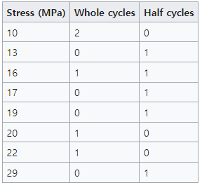 사이클수와 Stress를 구하는 방법은 위 그림처럼 인장(tensile)과 압축(compressive)로 나눠서 특정 조건에 들어가는 부분을 하프사이클(half cycle)로 계산하고 일치하는 하프사이클은 전체사이클(whole cycle)로 계산한다. 상세 내용은 위키피디아를 참조 하길 바란다.