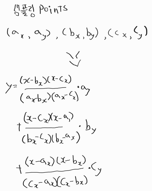 위 포인트로는 이해가 어려우므로 3개의 샘플링 포인트에 대한 2차 식이 유도된 결과를 확인하여 이해해보자