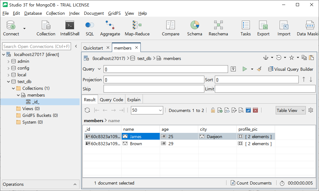 {'_id': ObjectId('60c8323a10918f591d9a79ba'), 'name': 'James', 'age': 25, 'city': 'Daejeon', 'profile_pic': ['pic_a.png', 'pic_b.png']}