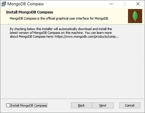 6. "Install MongoDB Compass" 는 설치하지 않는다. 버그가 많은 프로그램이라 추후에 robomongo 라는 프로그램으로 관리해준다.
