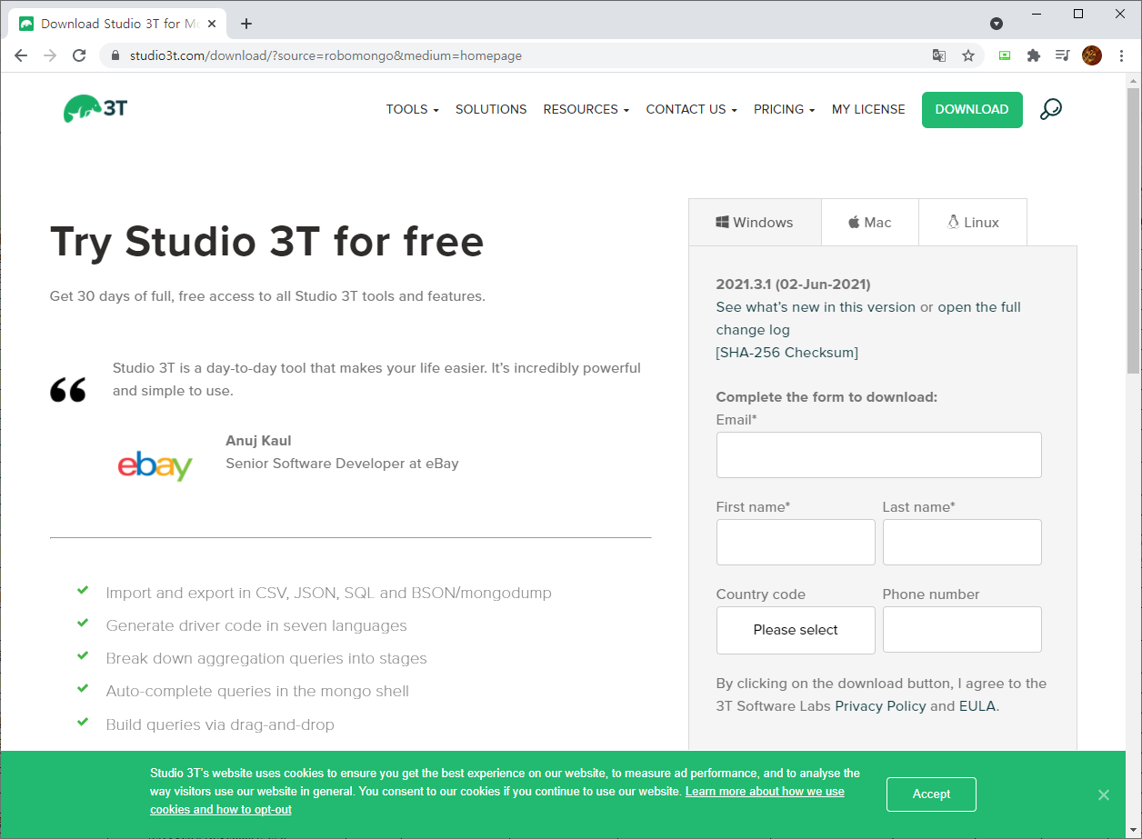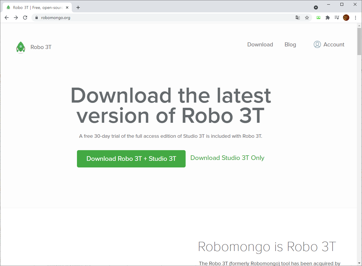 1. https://robomongo.org/ 에 접속 후 아래 그림7에 "Download Studio 3T Only"를 클릭한다.