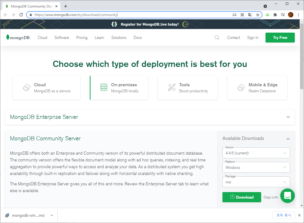 1. 괄호안의 사이트를 들어가서 아래 그림1과 같이 "On-premises", "platform: Windows", "Package:msi" 로 설정하고 msi 파일을 다운 받는다. (https://www.mongodb.com/try/download/community). 내 컴퓨터에 mongodb를 윈도우 버전으로 설치하는 파일을 받는 것이다.