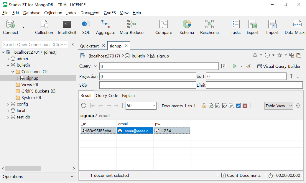 {'_id': ObjectId('60c95f83eba8b359121a310d'), 'email': 'aaaa@aaaa.com', 'pw': '1234'}