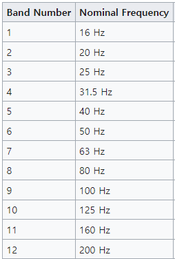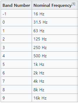 그림1은 위키피디아에서 가져온 octave band 테이블이다. band는 2배씩 커진다. 그리고 사람의 가청 주파수는 20Hz~20,000Hz 이기 때문에 이 근방의 분석을 하면 된다.