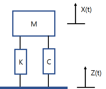 그림1은 진동 시험기(shaker)위에 시편(일반적으로 M(무게), C(댐핑), K(스프링)로 표현)을 올려 놓고 힘을 주었을 때 X와 Z변위가 시간에 따라 변하는 현상이다. 가속도센서(accelerometer)를 시편과 진동 시험기 판에 붙이면 X와 Z를 구할 수 있다.