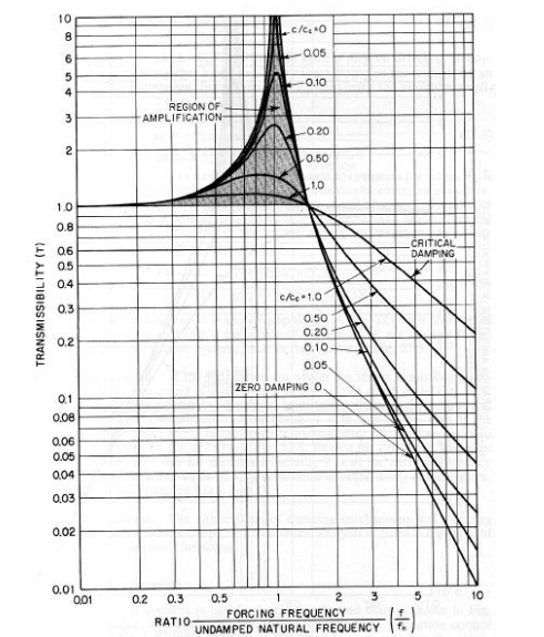 그림4의 최종 수식을 통해 r은 공진 주파수에 가까우면 1아 되고 감쇠비가 작을수록 전달률이 증가한다. r이 root(2) 가 될 경우는 진동 전달률은 항상 1이 된다. root(2)보다 커지면 진동 전달률이 작아지기 시작한다.