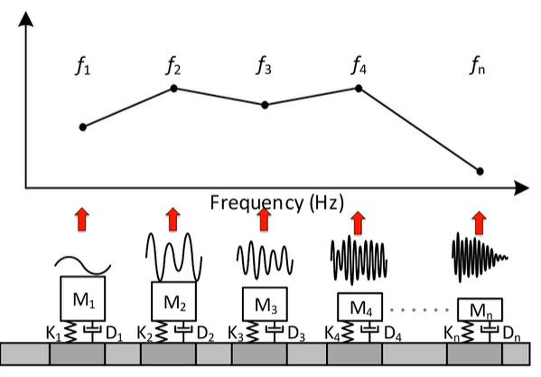 그림2의 아래 부분과 같이 측정 장치에 여러개의 SDOF (mass damper spring oscillator,오실레이터)가 있다. 그리고 각 각은 고유의 공진주파수(Natural resonant frequency)를(각각의 Damping, Q factor) 가지고 있다. 주파수는 Octave 로 증가하게 되어있다. Octave에 대한 설명은 괄호 링크를 참조하길 바란다. (https://scribblinganything.tistory.com/201)