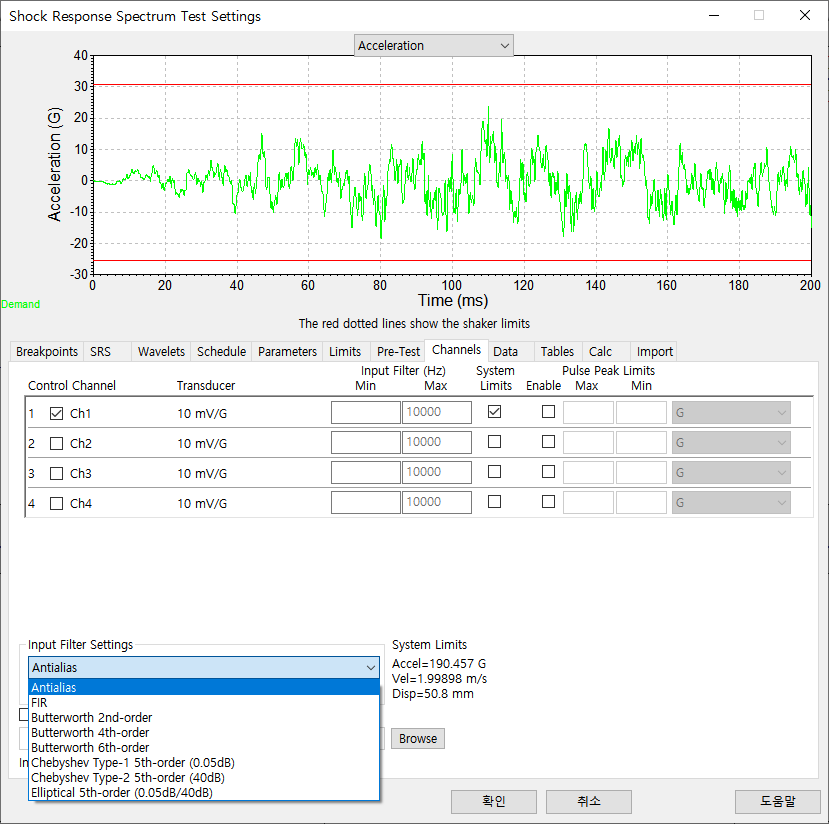 Control 센서에서 Hydraulic 진동기 같은 경우 고주파에서 Noise가 많이 발생하는데 위 필터들을 통해 제거 할 수 있다. 주의할 점은 Antialias와 FIR 필터는 측정 완료 후 적용되는 필터 이므로 SRS 시험에서는 Butterworth 나 Chebyshev, Elliptical 과 같은 필터를 추천한다.