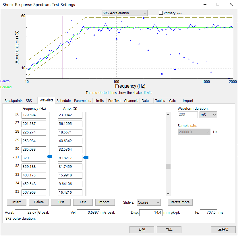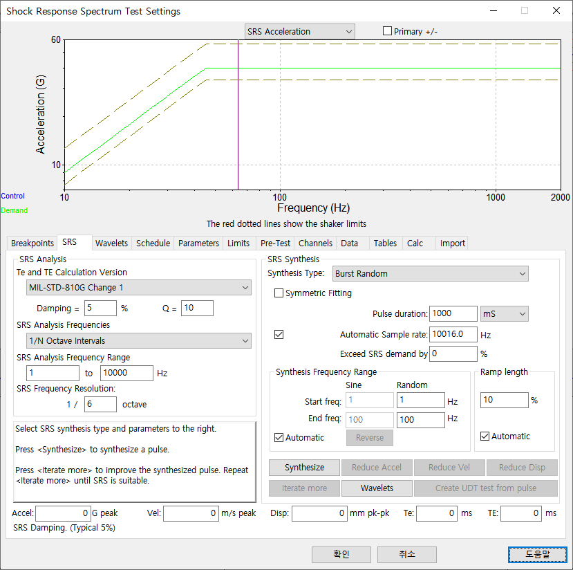 SRS 오실레이터의 Damping 과 Q 값을 정해야 한다. Damping 과 Q은 50/Damping Factor(%)의 관계를 가지고 있다. SRS Analysis Frequency는 앞서 오실레이터의 SDOF 주파수 간격이 일반적으로 Octave를 따른다고 하였다. 이를 구현 한것이고 이외에도 여러가지 주파수 분해 단위가 있다.