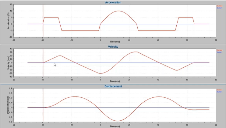 그림1은 진동 시험기에서의 충격 시험 펄스이다. 제일 위에 그림은 가속도 vs 시간 인데 Half sine pulse 를 넣는데 양 옆에 Compensation pulse가 들어가 있다. 충격 시험 전에 들어간 Compenstaion pulse 덕에 충격 펄스 시험 바로 전에 변위와 속도를 최대로 가져갈 수 있다. 그리고 충격 시험 펄스 이후에 Compensation pulse 를 통해 가속도, 속도, 변위를 모두 0으로 맞추어서 진동 시험기가 안정되게 만들었다.