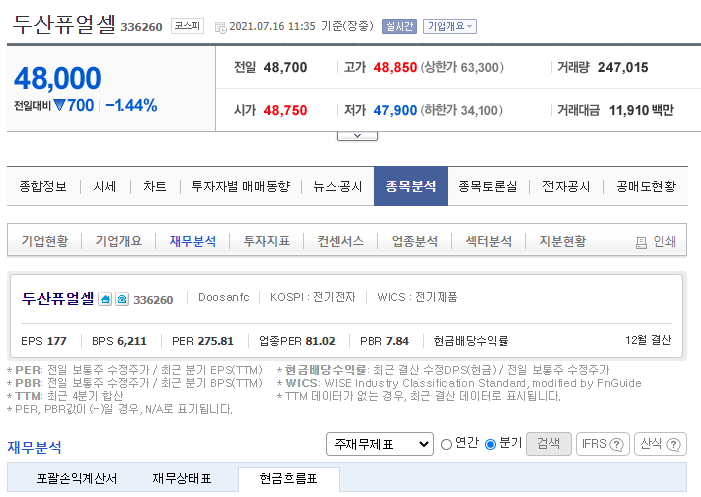 네이버 금융에서 현금흐름 확인하는 법 (ex.두산 퓨어셀)