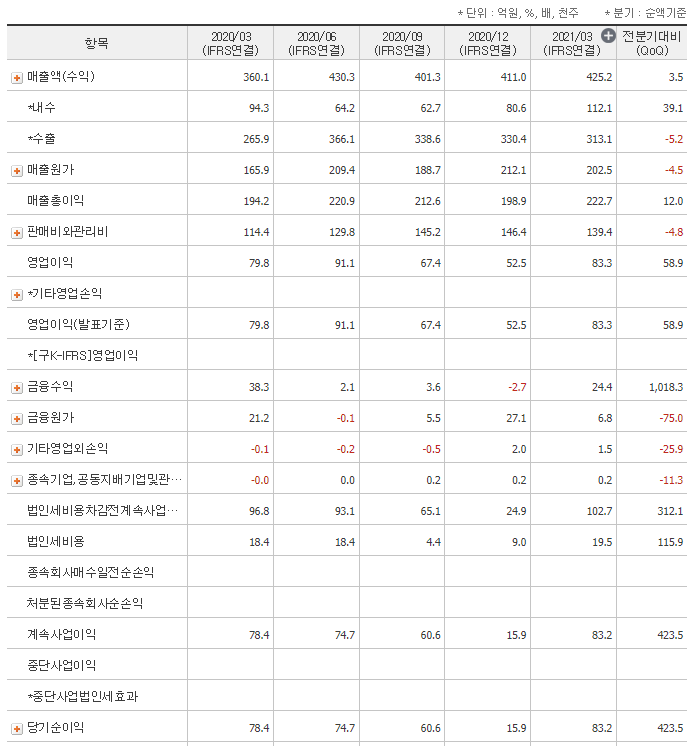 아래는 "뷰웍스"라는 회사의 재무제표를 네이버 금융에서 확인한 자료이다.