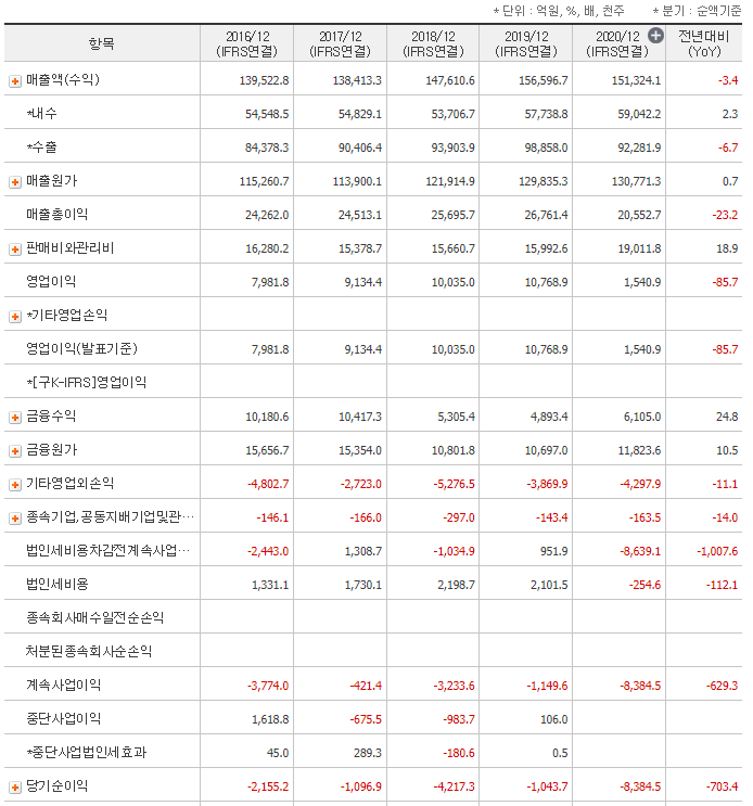 아래 차트는 네이버 금융에서 두산중공업을 검색하고 "종목분석" 탭을 클릭후 "재무분석"을 선택한다. 그리고 "포괄손익계산서"를 클리하면 아래와 같이 나온다.