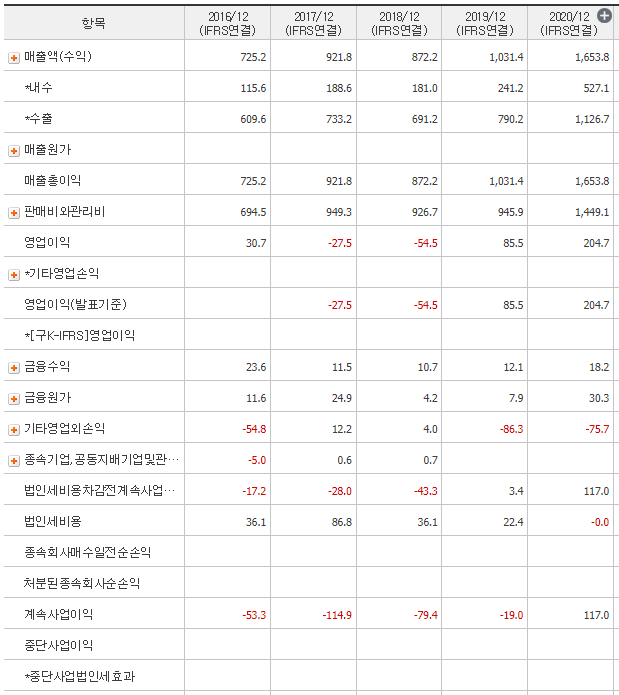 종목분석 -> 포괄손익계산서 를 클릭하면 아래 화면이 나온다.