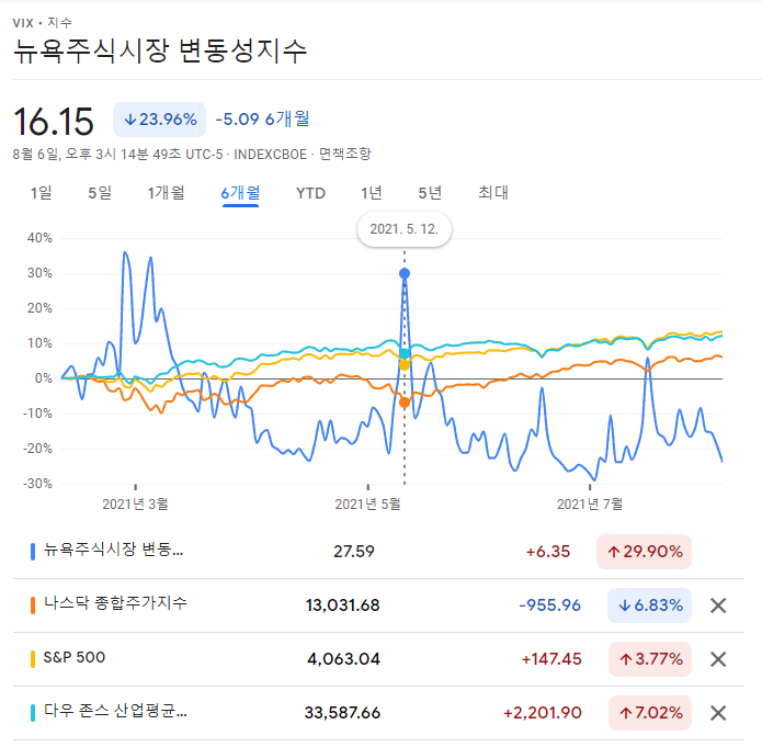 그림1은 구글금융에서 확인한 6개월 간의 VIX지수와 그 외 지표들을 백분율로 비교한 것이다.