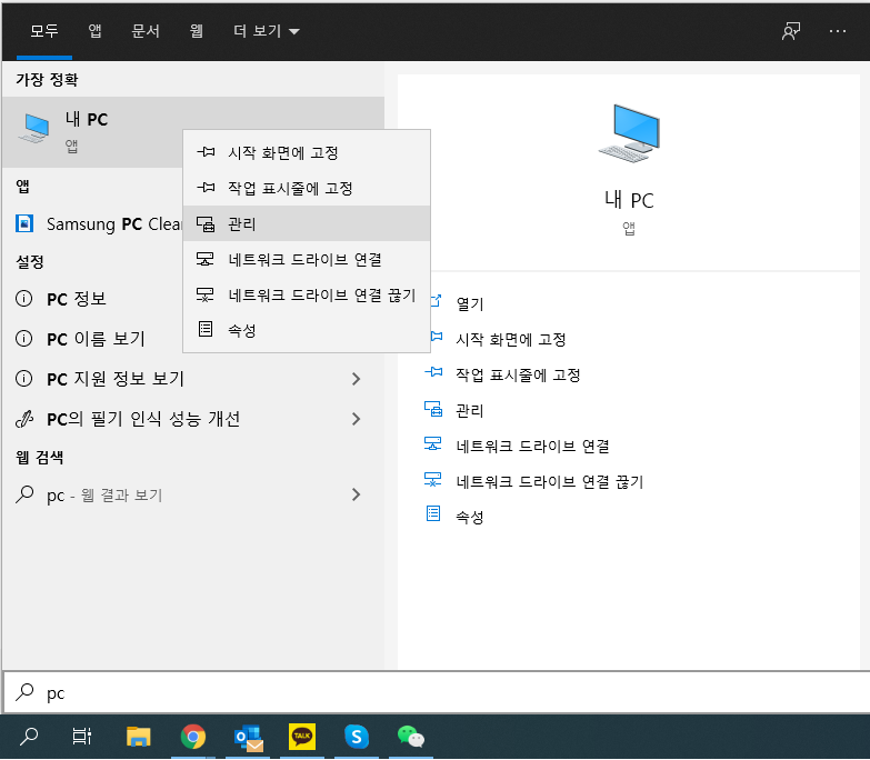 1. 그림1과 같이 검색창에서 pc를 검색하고 "내 PC"를 마우스 우측 클릭하여 관리를 누른다.