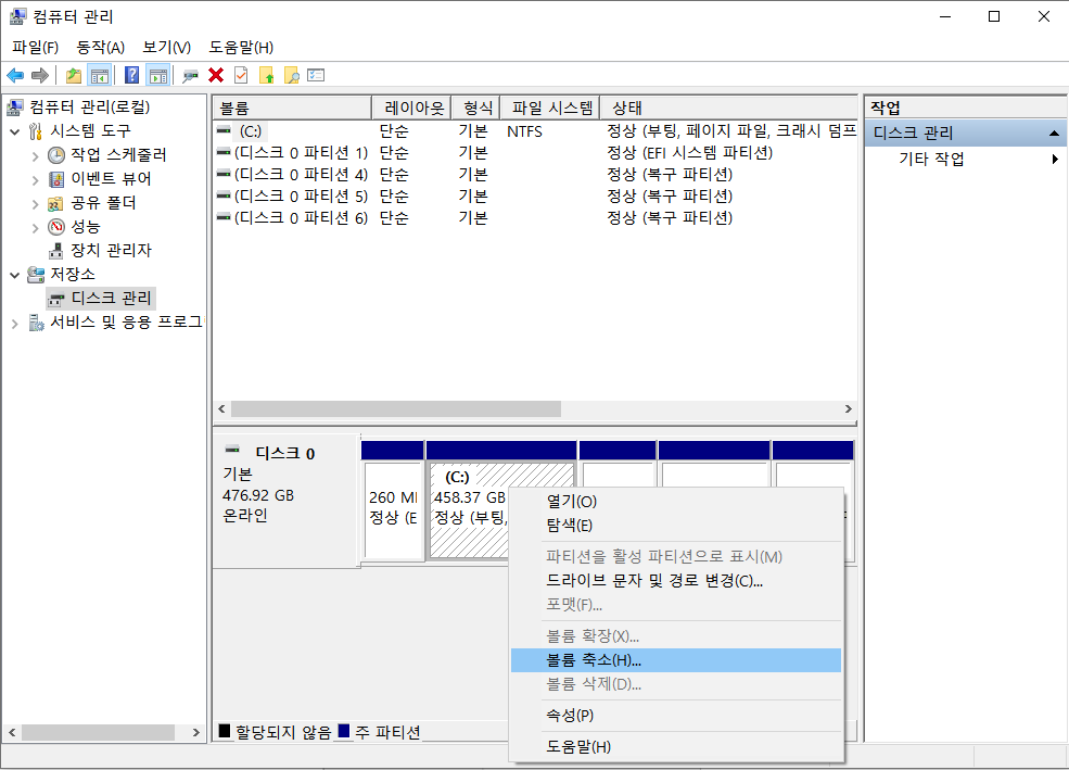 2. 그림2와 같이 "저장소" -> "디스크 관리" 에서 (C:) 를 선택하고 (C:) 영역에서 마우스 오른쪽 클릭 후에 불륨 축소를 누른다.