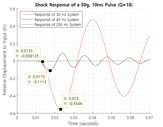 그림1은 50g 10ms 충격 시험 결과 30Hz, 85Hz, 250Hz의 시스템 응답의 상대적 변위 (입력 펄스 대비) 값을 측정한 것이다.