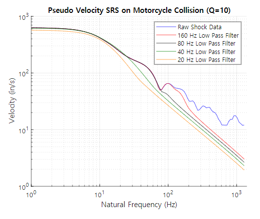 그림4는 pseudo 속도와 주파수에서의 그래프이다. 필터를 사용하는 여부와 상관없이 (고주파 제외) 속도값은 유사하게 나온다. 즉, 여기서 속도값이 주는 장점을 알 수 있다. 필터를 사용할 필요 없이 가속도에서 적분한 값이 필터와 유사한 효과를 준다. 그리고 앞서 얘기한 것과 같이 고주파 부분에서 가속도 값이 많이 줄었지만 가속도는 damage와 크게 관련이 없으므로 속도를 사용해서 damage에 대해 분석이 가능하다.