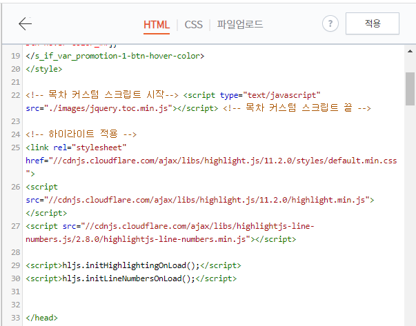 우선 https://highlightjs.org/download/ 사이트 안의 웹페이지에서 highlight.js 의 주소와 https://github.com/wcoder/highlightjs-line-numbers.js 에서 highlightjs-line 관련 주소를 가져와서 티스토리에 업데이트 하여야 합니다.