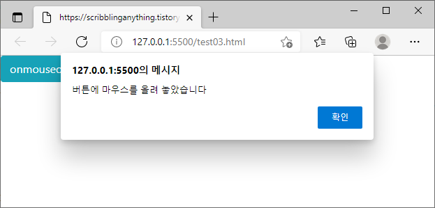 alert("버튼에 마우스를 올려 놓았습니다");