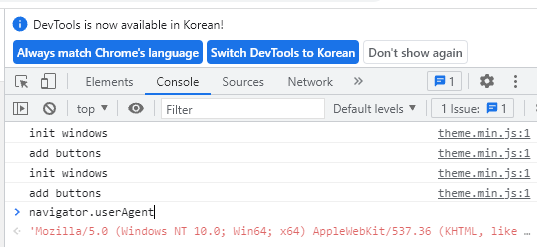 위 그림처럼 크롬 브라우져에서 f12 키를 눌러서 위 그림과 같은 화면이 나오면 Console 탭을 클릭하고 그리과 같이 navigator.userAgent 라고 입력하면 아래 빨간색 글씨로 해당 정보가 나옵니다.
