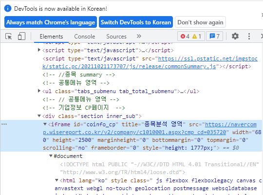 크롬 웹브라우져에서 <f12> 를 클릭하면 오른쪽에 검사 페이지가 생깁니다. 여기서 "Elements" 탭을 클릭해서 상세 페이지 내용을 확인합니다.