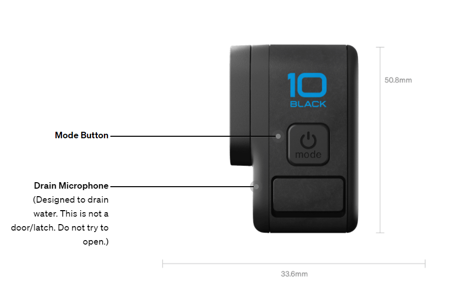 고프로에서 주장하는 내용에 따르면 히어로10은 153그램으로 히어로9 (158그램)에 비해 3퍼센트 정도 가벼워 졌다고 합니다. 외부에서 보이는 특징으로는 파워, 모드변경, 레코딩을 위한 버튼이 2개 있습니다. 그리고 2개의 스크린이 있고 래치 형태로 거는 배터리가 있습니다. USB는 USB-C를 지원합니다. 그리고 microSD 카드 슬롯이 있습니다.