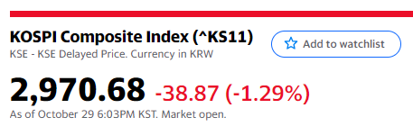 예제 코드에서는 Kospi(코스피) 정보를 가져오겠습니다. 아래 그림처럼 야후 금융에서 Ticker 값을 확인하니 ^KS11 임을 알 수 있었습니다.