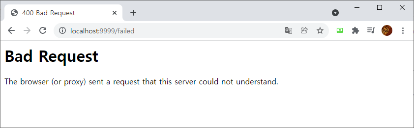 그리고 페이지는 Redirecting 상태로대기하고 있습니다. /failed 를 클릭하면 아래와 같이 error 코드(Bad Request)가 발생합니다.