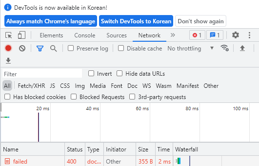 상태 코드도 400번으로 정상적으로 나옵니다.