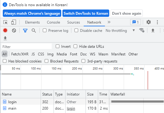 크롬브라우져(Chrome Browser)를 사용해서 위와 같이 302번의 Status Code가 정상적으로 들어왔음을 알 수 있습니다.