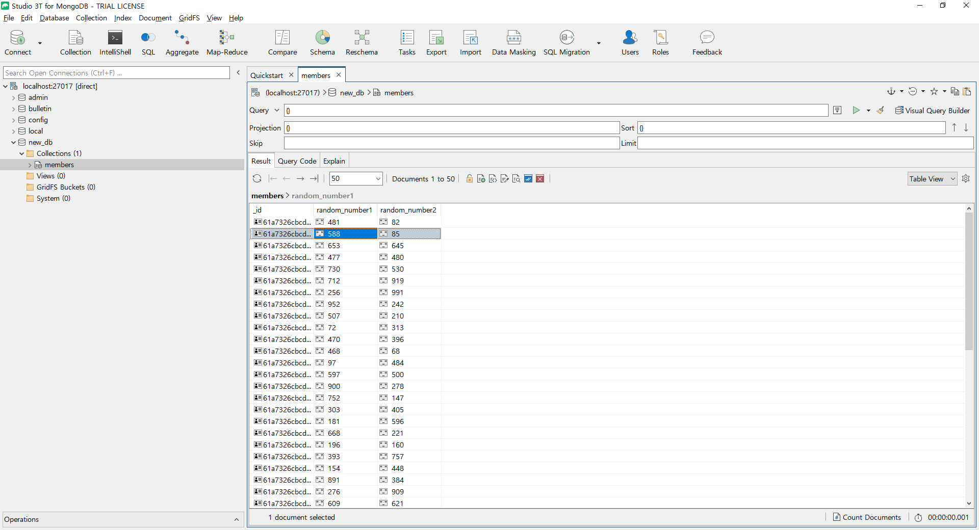 {'_id': ObjectId('61a7326cbcd1c8ff79471520'), 'random_number1': '909', 'random_number2': '485'}