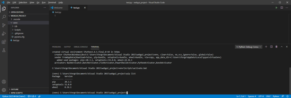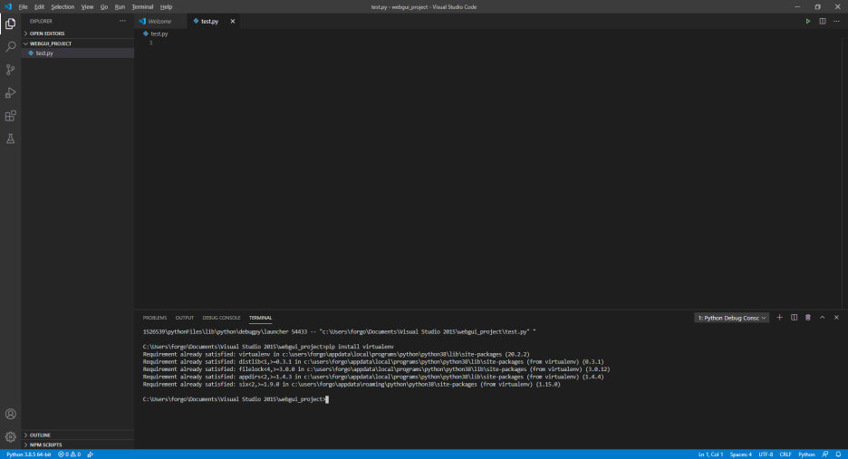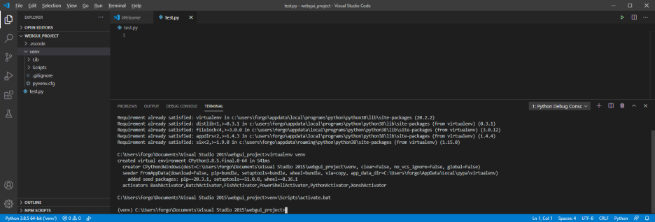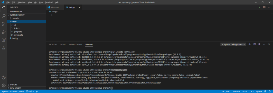 가끔 virtualenv를 설치하고 바로 실행하면 안되는 경우가 있는데 visual studio를 껐다 키고 실행하기를 추천한다.
